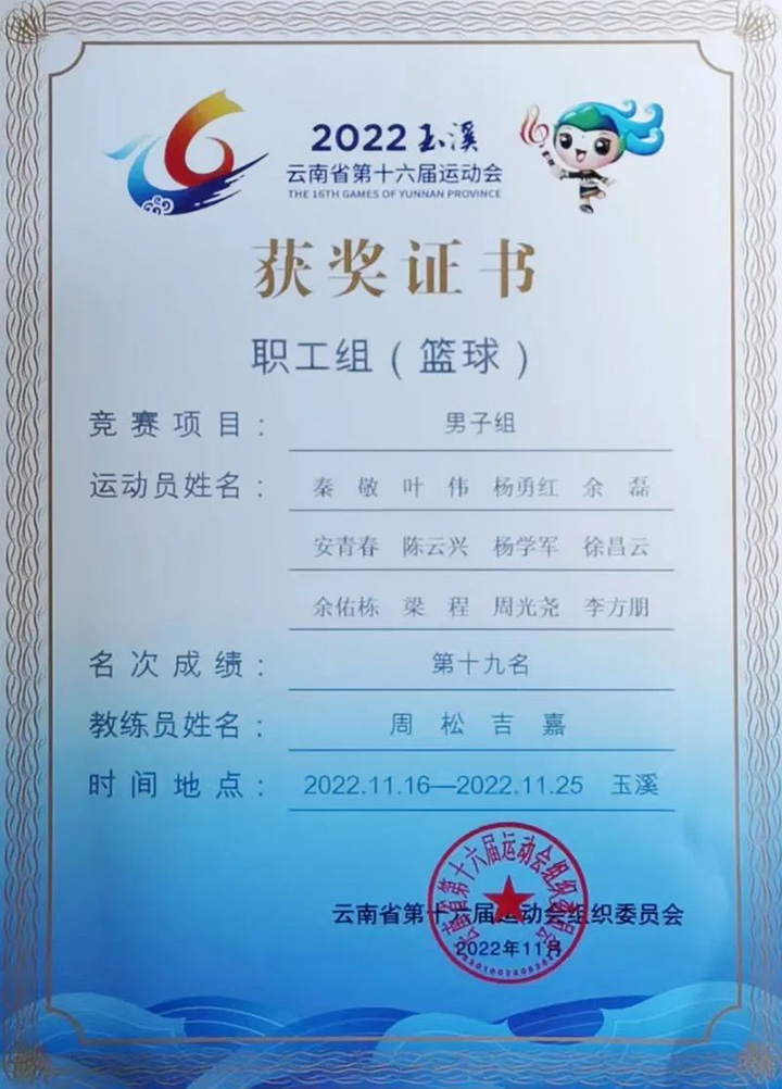 四年一届的省运会由云南省体育局、云南省教育厅、云南省总工会主办,玉溪市人民政府承办。集团加入了职工组篮球、羽毛球、乒乓球、气排球、健身操五个项目,共有81名运发动和12名教练员加入角逐。集团工会选送的《飞越的心》和《欢喜中国欢喜家》划分荣获健身操飞越的心第一名和广场舞第四名,解化分公司周洁获个人“品德民俗奖”;篮球项目在38支代表队中获得团体第十九名,国家矿山应抢救援东源队秦敬获个人“品德民俗奖”;羽毛球项目获得女团第五名,曲煤焦化公司王俊、云煤矿业公司李晓婷获个人“品德民俗奖”;先锋化工李天翠、解化分公司陈治宇获乒乓球项目个人“品德民俗奖”;曲煤焦化公司高伟刚、解化分公司丁娅获气排球项目个人“品德民俗奖”。