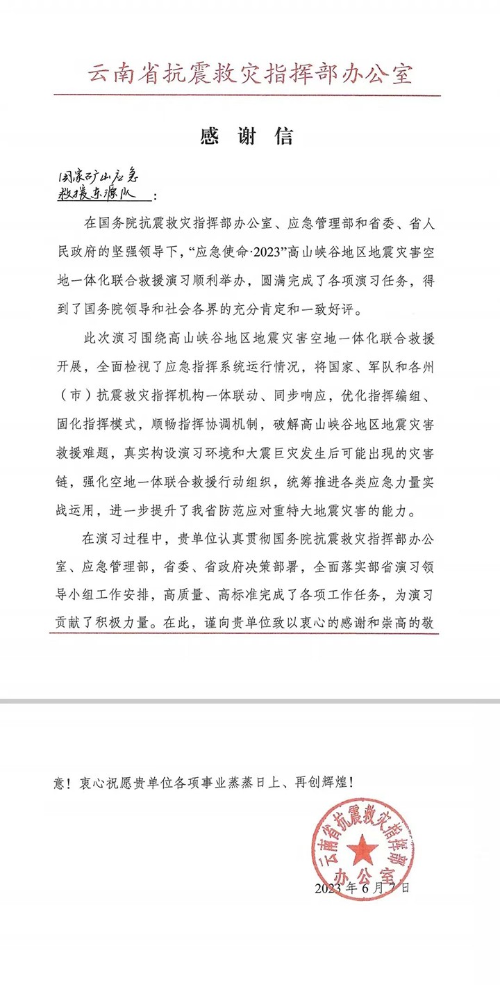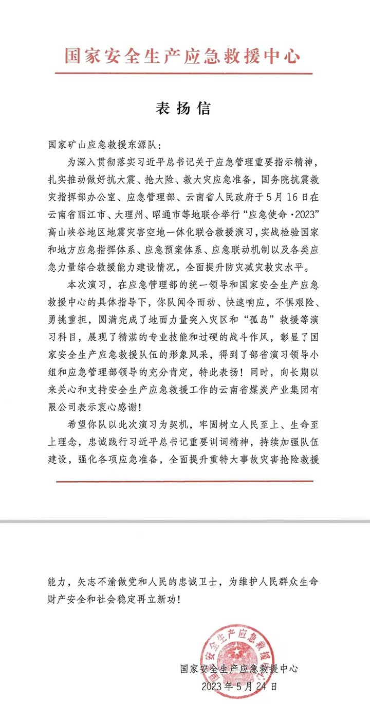 ´Ë´ÎÊÕµ½µÄ±íÑïÐźÍллÐÅ£¬Êǹú¼ÒÄþ¾²Éú²úÓ¦ÇÀ¾ÈÔ®ÖÐÐĺÍÔÆÄÏÊ¡¿¹Õð¾ÈÔÖÖ¸»Ó²¿°ì¹«ÊÒ¶Ô¿óɽӦÇÀ¾ÈÔ®¶«Ô´¶ÓÊÂÇé½á¹ûµÄ¸ß¶ÈÔÞÑ¸üÊǶԿí´óÓ¦ÇÀ¾ÈÔ®Ô±¼ÌÐø×÷Ϊ¡¢Ó­ÄѶøÉϵÄÍÆ¶¯ºÍ¼¤Àø¡£ÐÅÖУ¬¹ú¼ÒÄþ¾²Éú²úÓ¦ÇÀ¾ÈÔ®ÖÐÐÄÏòºã¾ÃÒÔÀ´ÌåÌùºÍÖ§³ÖÄþ¾²Éú²úÓ¦ÇÀ¾ÈÔ®ÊÂÇéµÄÔÆÄÏʡú̿¹¤Òµ¼¯ÍÅÓÐÏÞ¹«Ë¾ÌåÏÖÖÔÐÄлл£¡