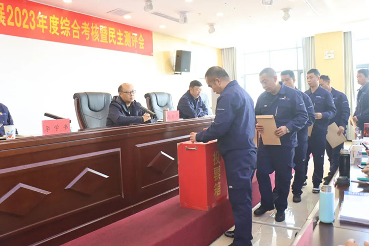近日,云煤(k8凯发天生赢家)集团第九考核组到罗平东城公司开展2023年度综合考核暨民主测评。公司党总支书记、董事长李世荣主持集会,公司领导班子成员、中层治理人员、职工代表等共40人加入考核测评会。